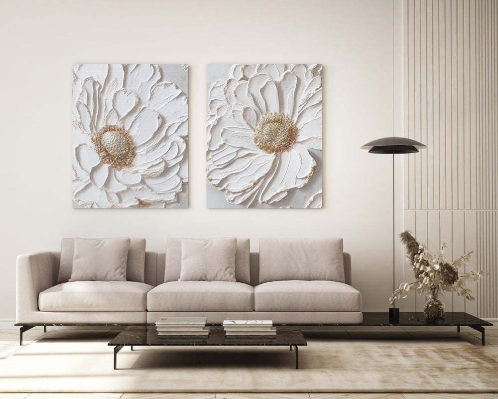 •لوحات قماشية مشدودة على إطار مخفي او مع امكانية اضافة برواز خارجي